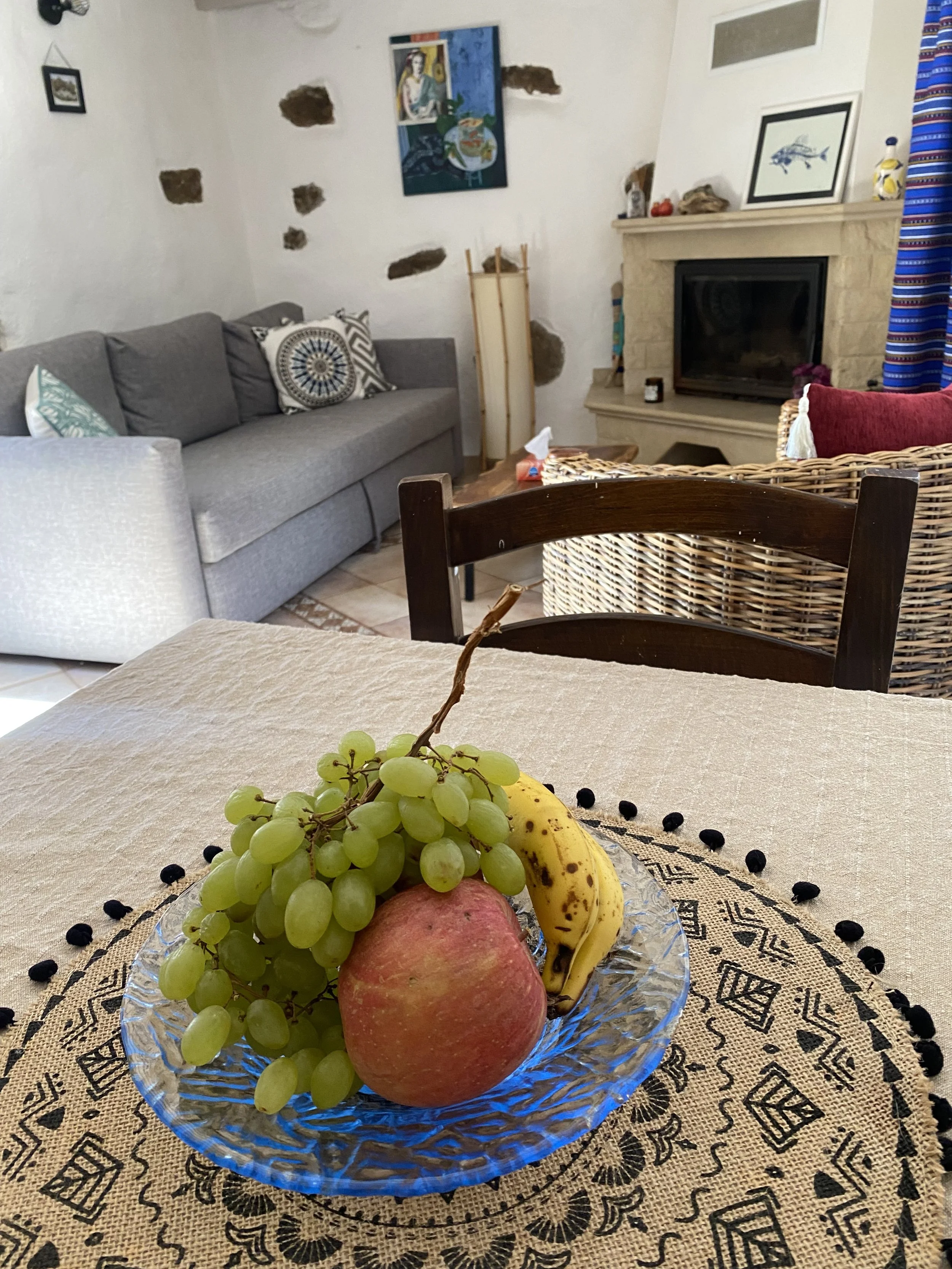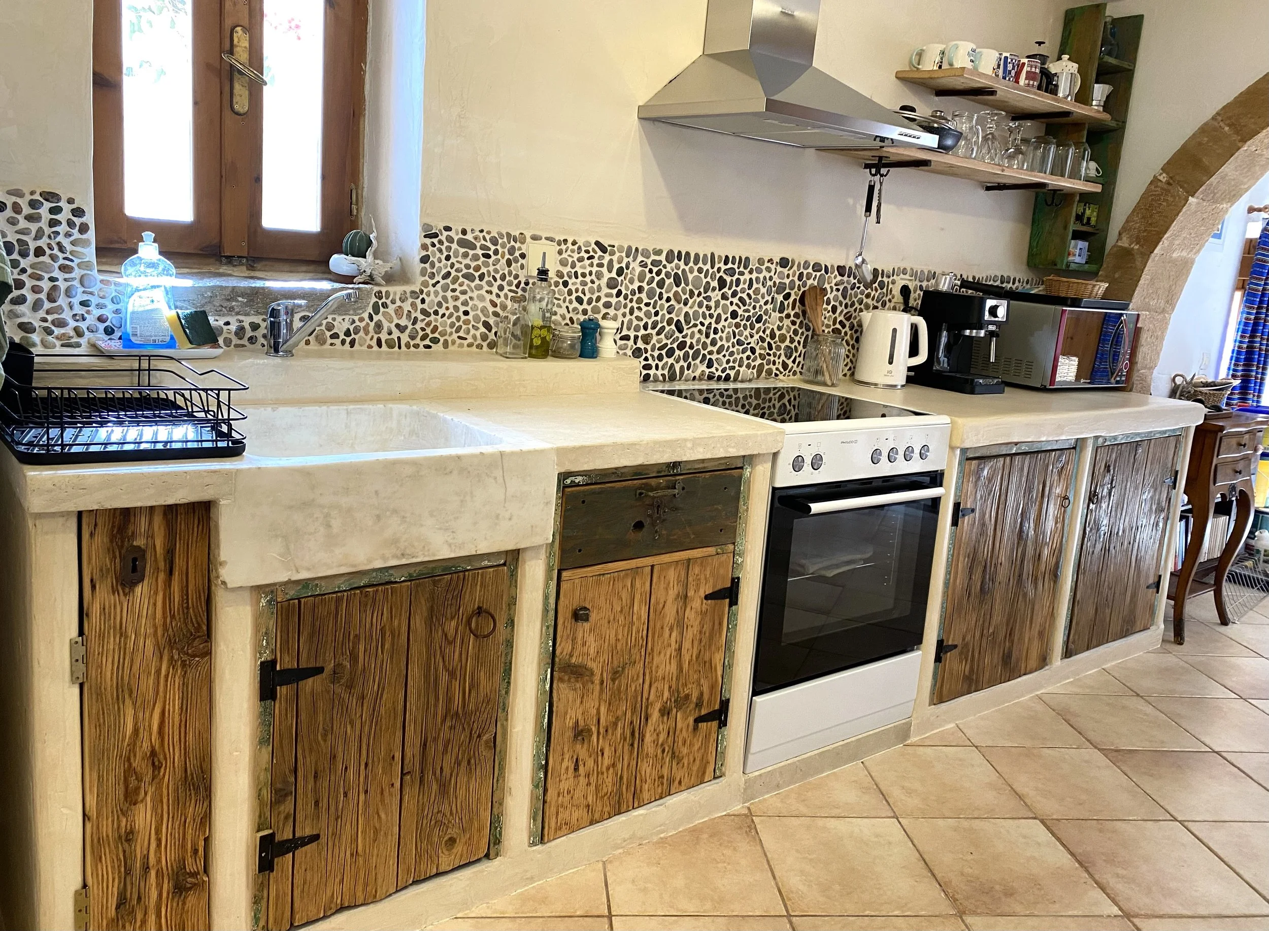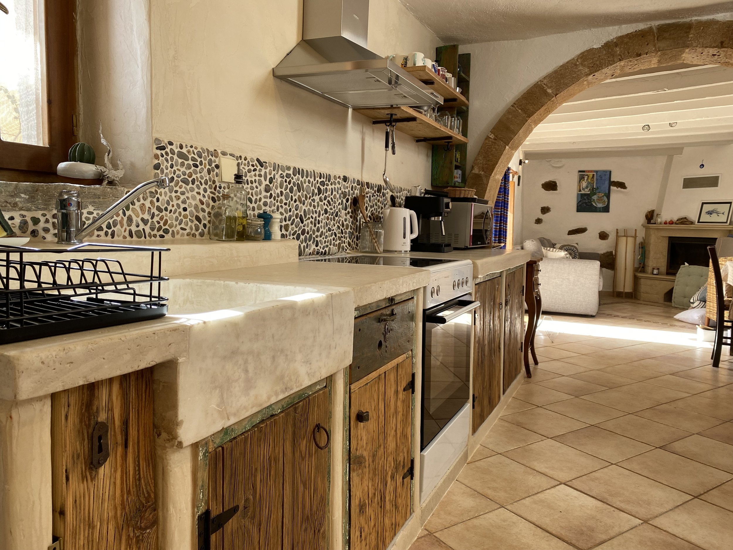 Les espaces salon et cuisine sont séparés par une arche typique des maisons traditionnelles Crétoise.